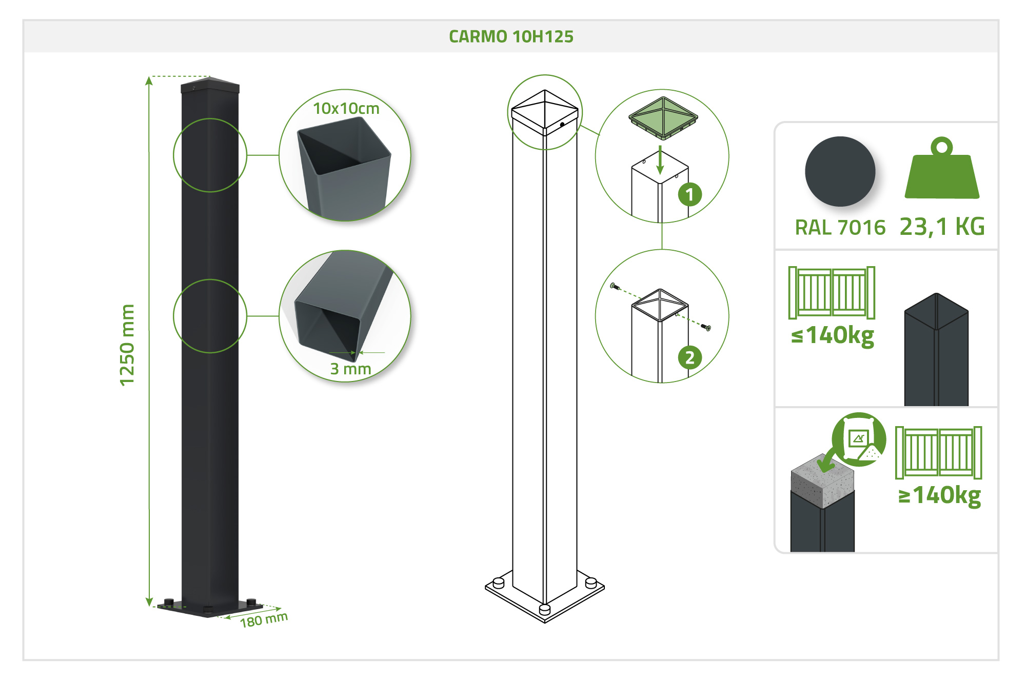 Šie 125 cm CARMO plieniniai stulpai skirti 120 cm aukščio NALI ir pėsčiųjų vartams montuoti, užtikrindami patikimą ir ilgaamžę atramą jūsų lauko instaliacijoms.