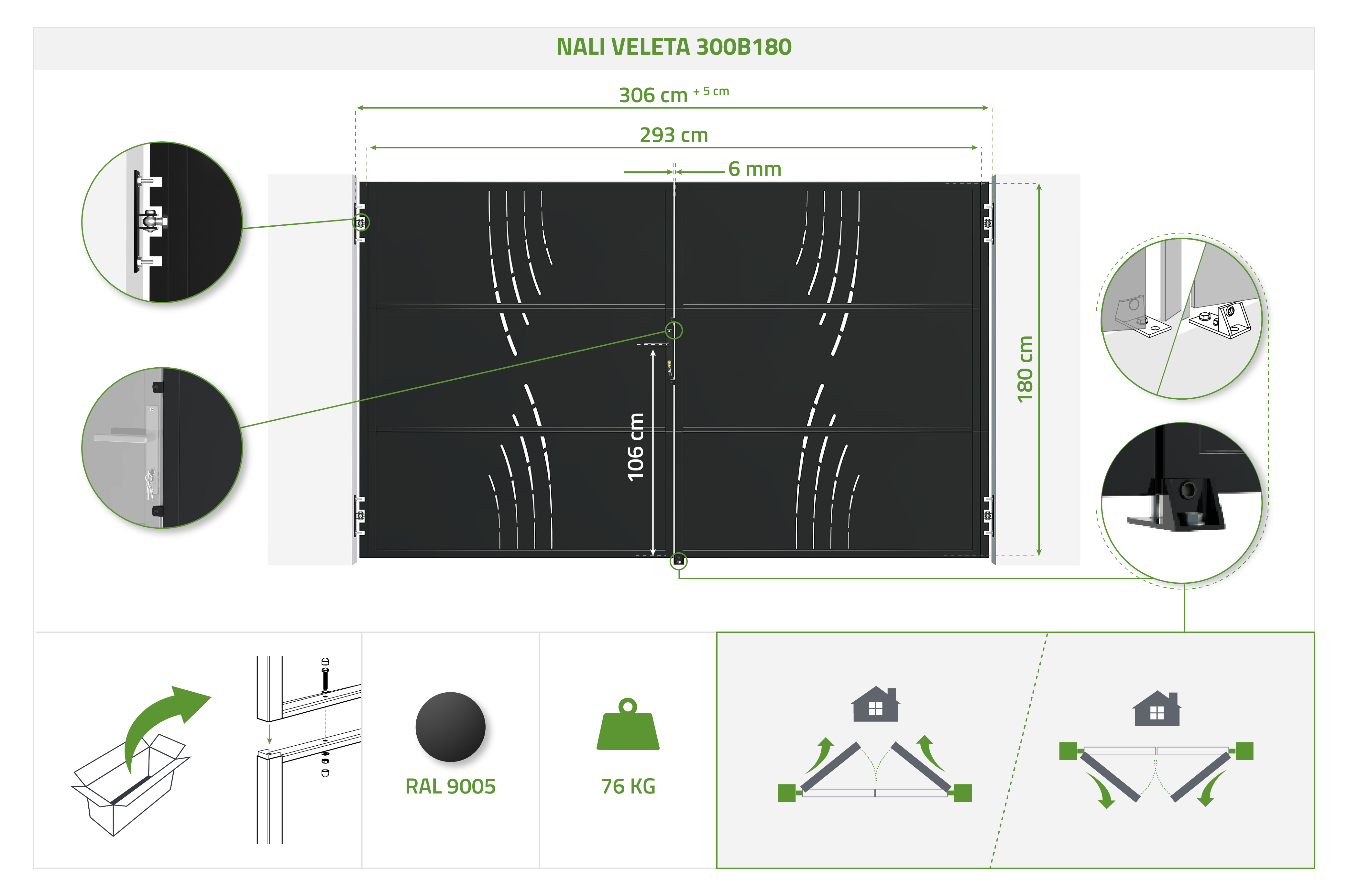 3 m matinės juodos spalvos plieniniai vartai NALI VELETA A.180 cm
