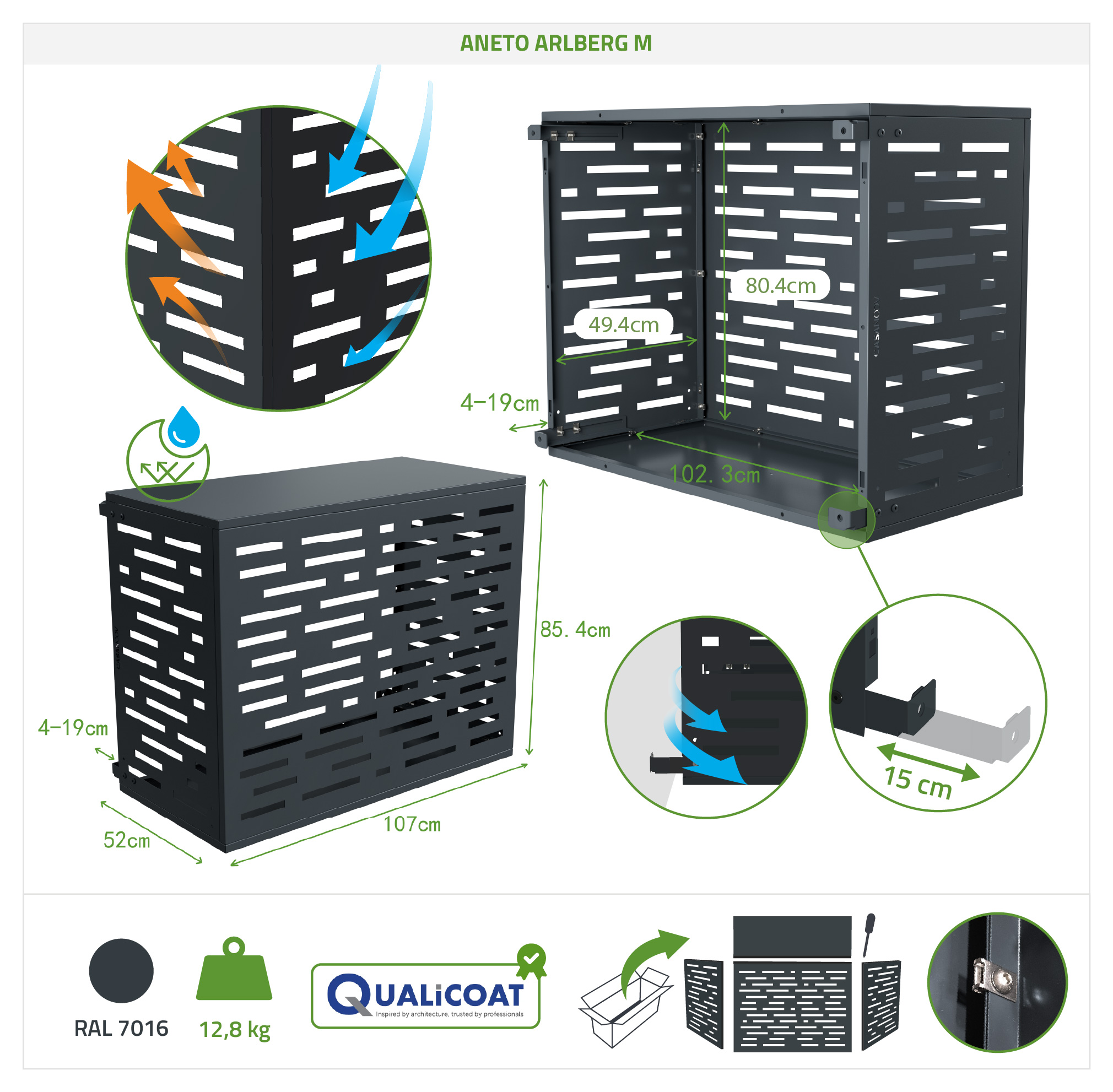 „Aneto Arlberg“ aliuminio oro kondicionieriaus dangtelis žavi savo švariu dizainu ir ažūrinėmis grafinėmis linijomis, kurios suteikia jūsų eksterjerui modernumo. Jo aliuminio konstrukcija užtikrina lengvumą ir optimalų atsparumą oro sąlygoms, kartu palengvindama montavimą ir priežiūrą. Šis funkcionalus ir estetiškai patrauklus oro kondicionieriaus / šilumos siurblio dangtelis diskretiškai paslepia jūsų įrenginį, suteikdamas harmoningą ir elegantišką išvaizdą. Šis aliuminio dangtelis, modernus dekoratyvinis aksesuaras, skirtas pagerinti jūsų fasadus ir kartu efektyviai apsaugoti jūsų įrangą.
