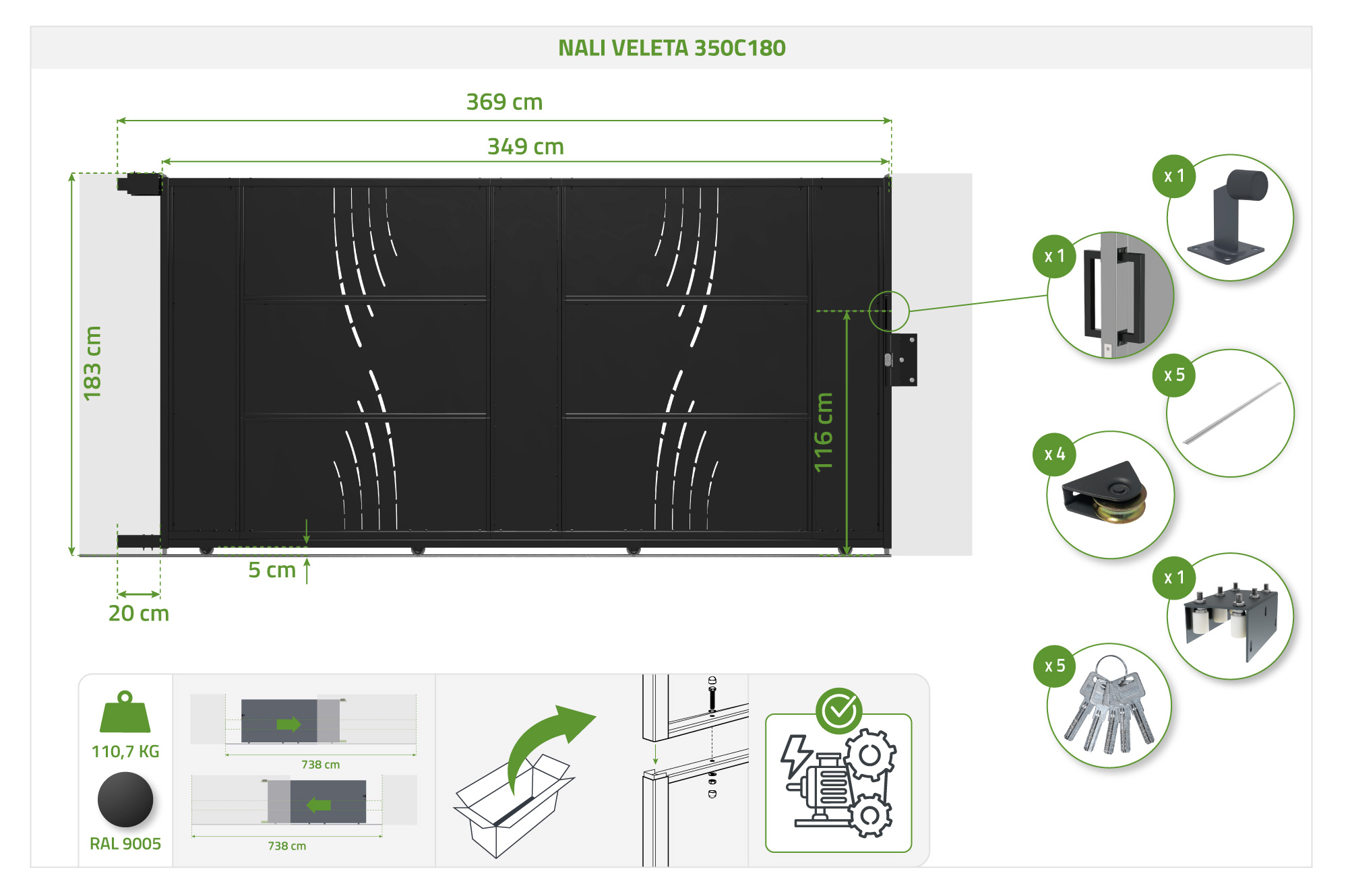 NALI VELETA 3,5 m plieniniai stumdomi vartai, 180 cm aukščio, juodi